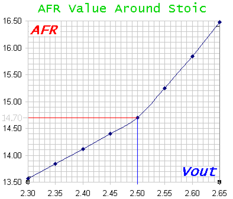 Simulated Narrowband Output NBout - D/A Pin 3The graph shows how the simulated narrowband output rapidly switches from a high value of around 1.0 Volts to a low value of close to zero volts. This occurs at a point that is user settable using the NB-SET control (inside the WB unit case). Remember that most vehicle ECUs are set to switch at a narrowband voltage of 450 mVolts. In this example the 450 mv NBout signal occurs at a Vout of ~2.517 mV which, using this Vout vs AFR graph, corresponds to an AFR of around 14.86. This means the NB set control has shifted what the ECU thinks is an AFR of 14.7 to a real value of close to 14.9, or almost a 0.2 AFR LEANER stoic setting. |