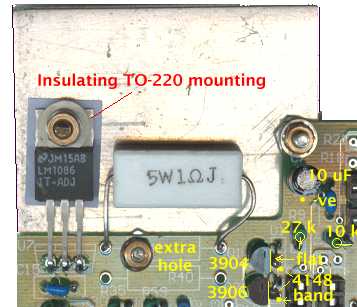 If you have not already drilled a hole in the PCB for mounting the heatsink (as noted above), do so now. Leave the leads on the 6.8 ohm resistor long enough to allow the nut to be done up on the mounting bolt without interference with the 6.8 ohm 1 Watt resistor. The image shows three highlighted mounting points for the heatsink. It also shows the LM317 (U7) soldered from the bottom of the PCB. As noted above, R40 is an additional 1 Watt resistor in parallel with the 5 Watt 1 ohm resistor (R41). It's value decreases the combined resistance between the ADJ and OUT terminals of the regulator. The regulator tries to maintain 1.25 volts across ADJ and OUT. The maximum heater current of 1.5 amps therefore requires a resistance of 1.25/1.5 = .83 ohms. A 6.8 ohm resistor in parallel with the 1 ohm resistor will have a resistance of 1/(1/1 + 1/6.8) = 0.872 ohms giving a max current of 1.25/0.872 = 1.43 Amps. Latest kits are supplied with a 6.8 ohm 1 W resistor for R40, although you could try a 5.6 ohm resistor that would give a calculated Imax of 1.47. Be aware that the 1 ohm resistor has a tolerance of 5%, which means it may be as low as 0.95 ohms, in which case a 6.8 ohm resistor in parallel will have a combined resistance of 0.834 ohms, and an Imax of almost exactly 1.5 Amps. |